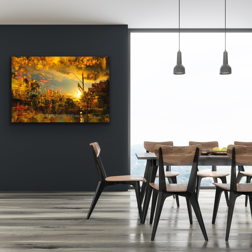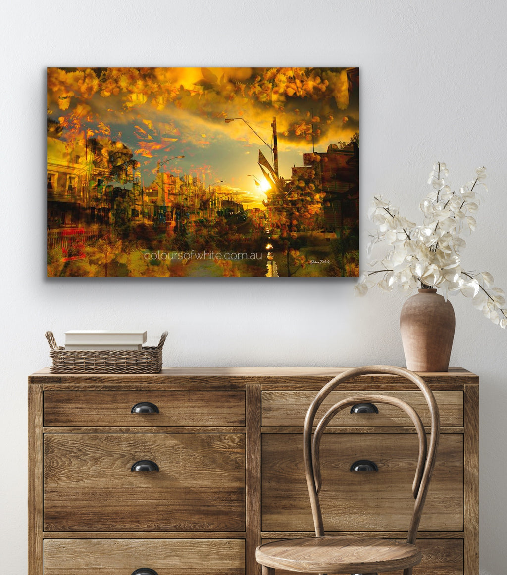 Imagine this artwork in your living room, the sun shining across the room bouncing off this beautiful glaring afternoon sunset ~ just magical. It has warming earthy colours and features the historic streetscape of Piper Street, Kyneton.
